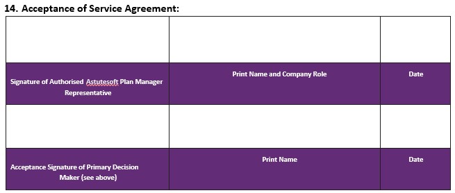 The Service Agreement carries on while you stay with Astutesoft Plan Manager. You don’t have to renew it when your NDIS Plan changes.